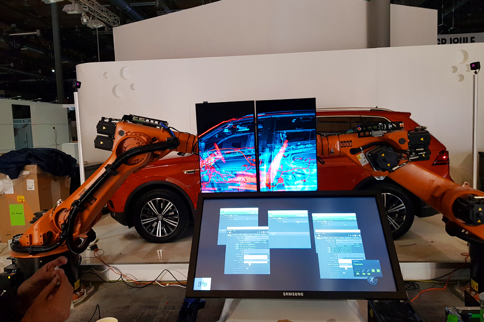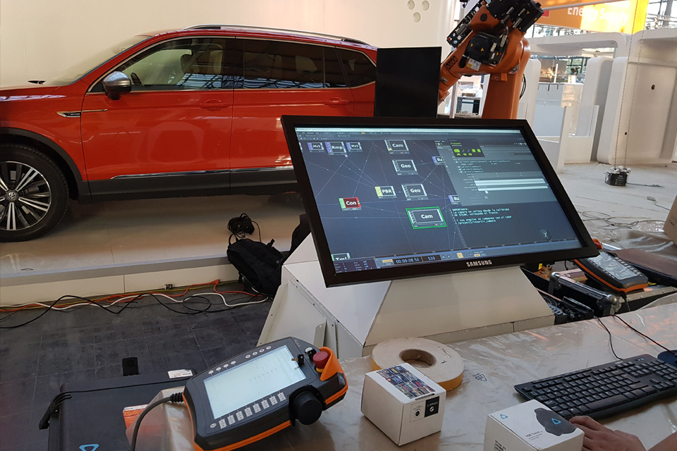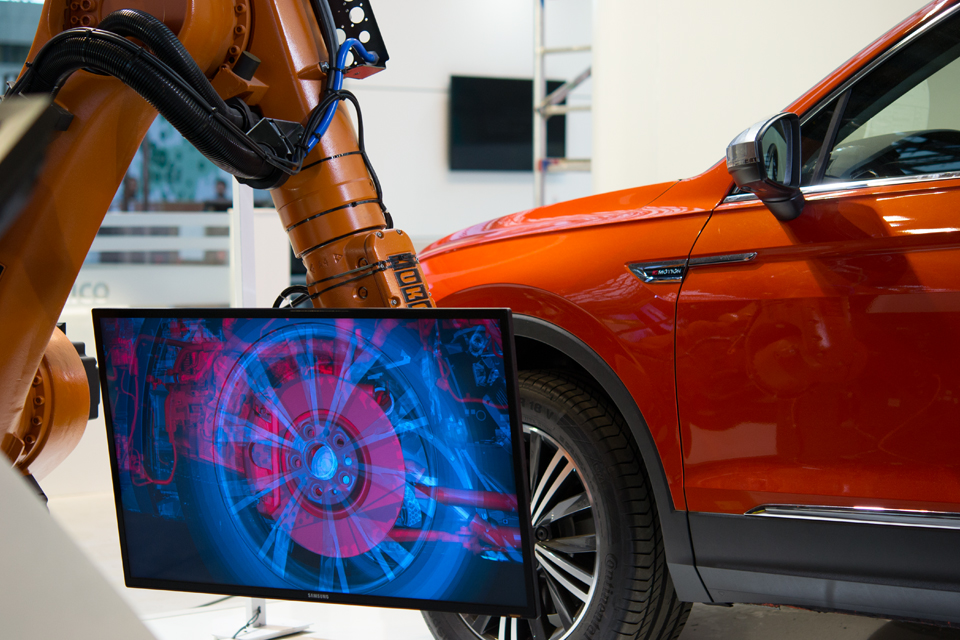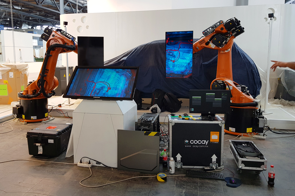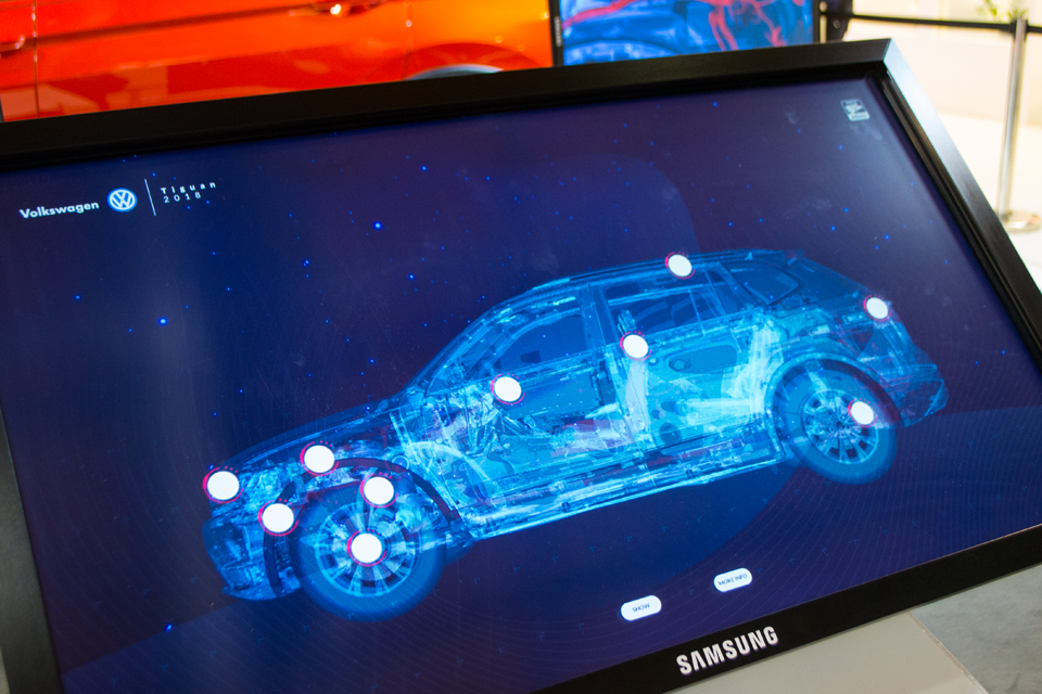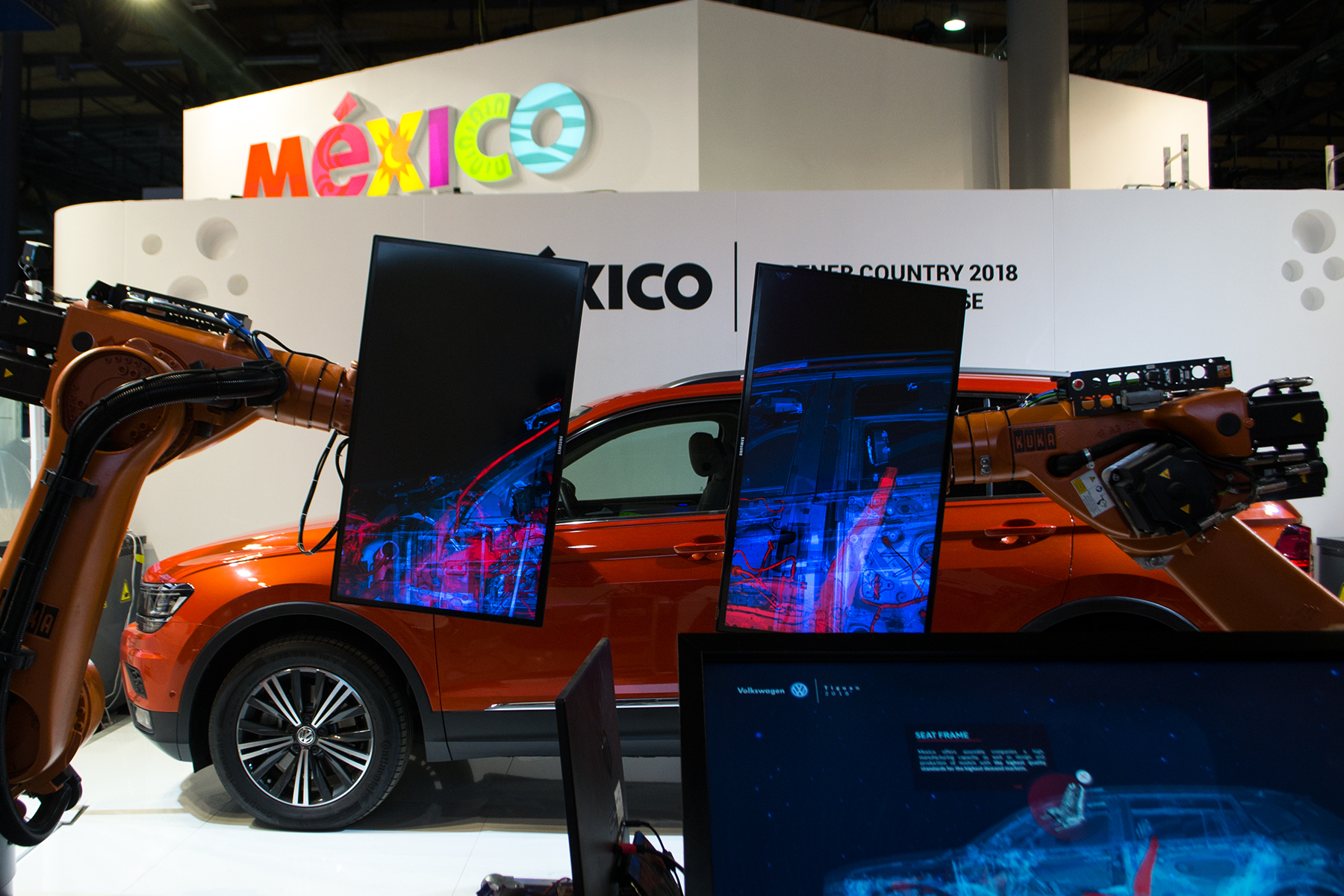 Desarrollamos una experiencia interactiva con la colaboración de nuestro estudio amigo Quarso. La importancia de la experiencia es mostrar la cantidad de piezas que se producen en México de la camioneta Tiguan 2018 de Volkswagen, su capacidades de producción, exportación al mundo, datos e información, esto a través de una interfaz touch que controlaba toda la información y un recorrido de las distintas posiciones de las piezas seleccionadas con la ayuda de pantallas y un par de brazos robóticos (Kuka Robotics).